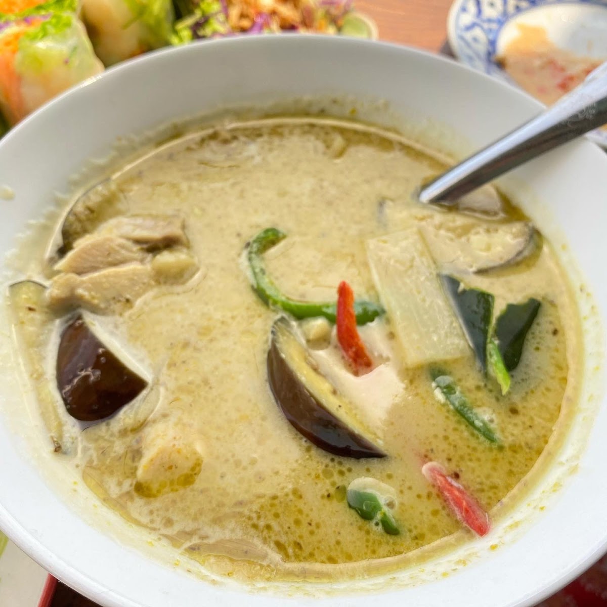 The restaurant's signature dishes are sure to impress. One of the highlights is the Seafood Gapao with Rice-a mouthwatering dish packed with fresh seafood and seasoned to perfection with Thai basil and chili. If you’re in the mood for something hearty and comforting, the カオマンガイ (Khao Man Gai), a flavorful Thai-style chicken and rice dish, is a must-try. It’s tender, juicy, and the sauce brings out the flavors beautifully. For fans of curry, the グリーンカレー (Green Curry) provides the perfect balance of spice and creamy coconut, filled with vegetables and your choice of protein. Another favorite is the Thai Style Vermicelli Salad, which is refreshing, light, and full of vibrant flavors that will transport you straight to Thailand.