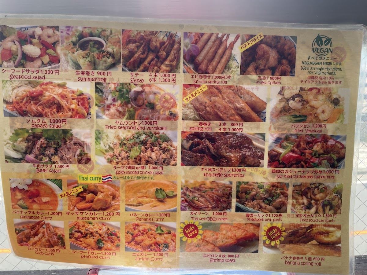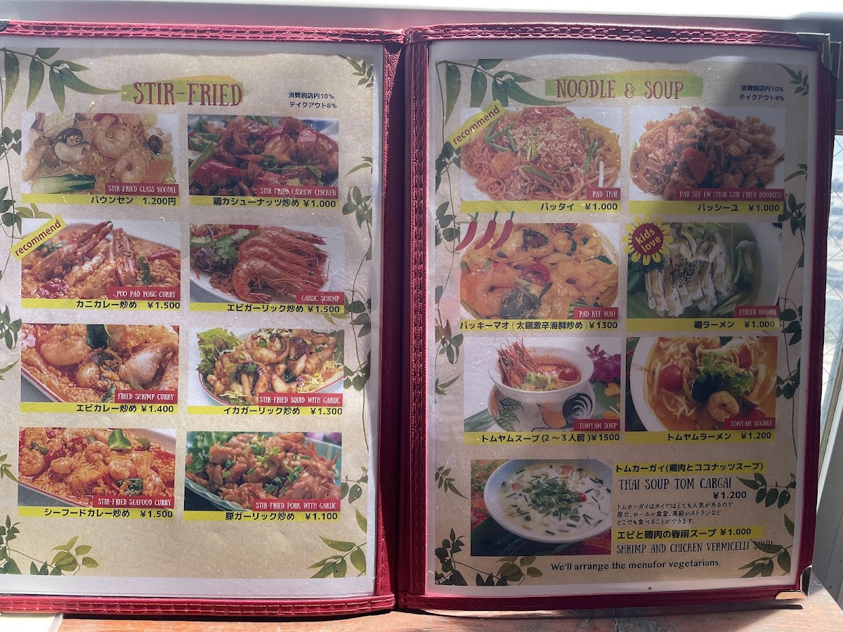 Vegetarians can enjoy the ベジタリアンパッタイ (Vegetarian Pad Thai), a delicious noodle dish packed with fresh vegetables, or the ヤムウンセン (Yam Woon Sen), a spicy glass noodle salad with a tangy dressing. The スペアリブ (Spare Ribs) provide a juicy, savory option, while the Smoothie Mangue offers a refreshing mango smoothie to cool down the spice.