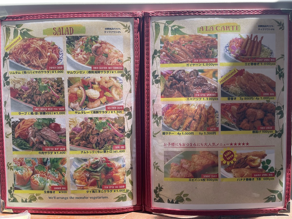 Another must-try is the グリーンカレー (Green Curry), a rich, coconut-based curry packed with bold flavors and a hint of spice. If you're in the mood for something refreshing, the Thai Style Vermicelli Salad offers a zesty and light option, perfect for a warm day. For a unique twist, the パイナップルカレー (Pineapple Curry) blends the sweetness of pineapple with the savory heat of curry, creating a satisfying balance.