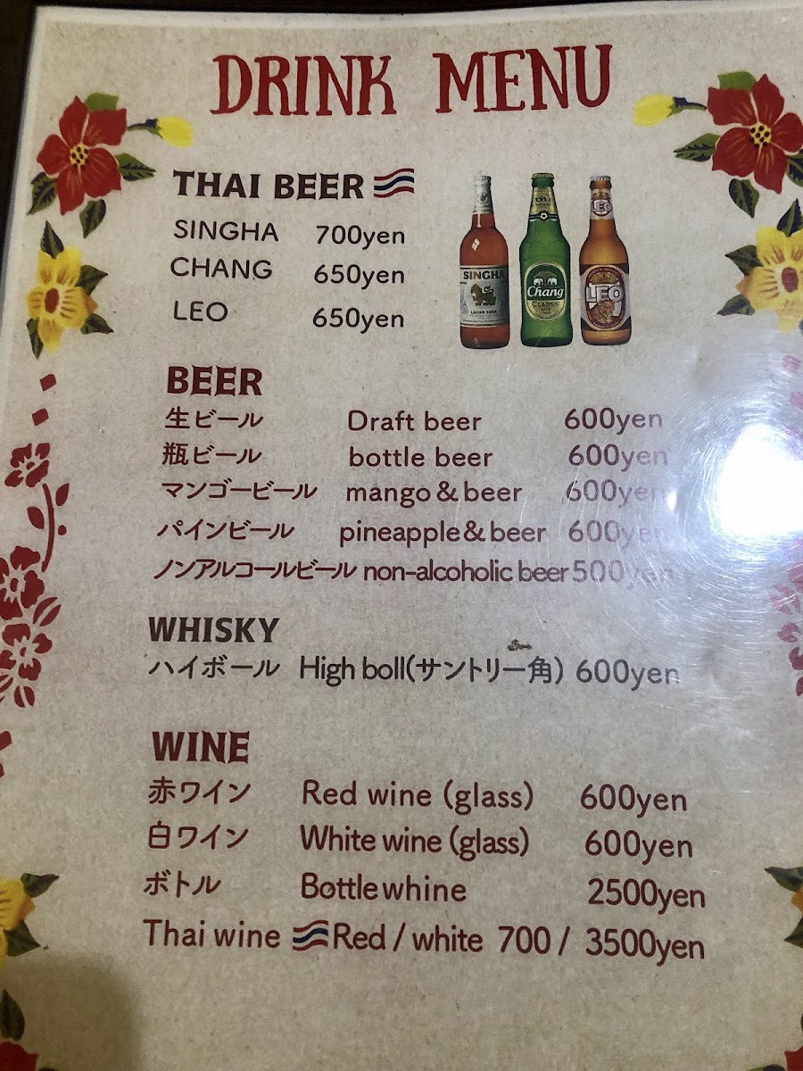 For a lighter bite, the トムヤムクンスープ (Tom Yum Kung Soup) is a flavorful, spicy-sour soup that’s perfect to start your meal. You can also try the イカのガーリック炒め (Garlic Stir-fried Squid), a dish featuring tender squid sautéed with aromatic garlic, or the 空芯菜炒め (Stir-fried Water Spinach), a healthy and delicious vegetable dish.